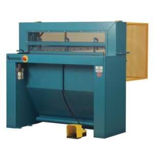 Pneumatically operated plate shears with heavy compact welded steel construction. The machine is operated pneumatically by using a pedal protected with a safeguard shield. Suitable for cutting of metal and other materials. Automatic sheet holder coated with neoprene rubber to avoid scratches in aluminium products. It offers a good view of the complete cutting length and is supplied with light. The mechanical power is conveyed to the knife by two parallel-active toggle-joint press. The machines are supplied with built in working light, adjustable angle stops and guide bars with scale in mm.